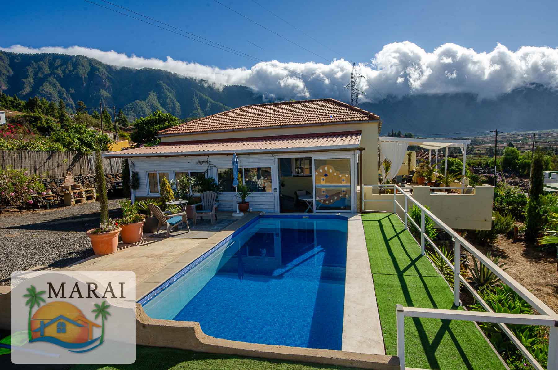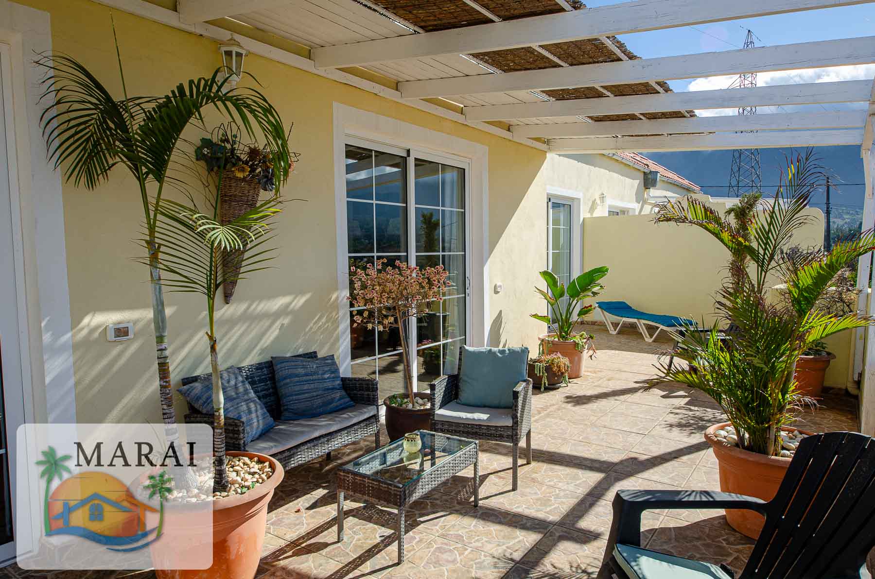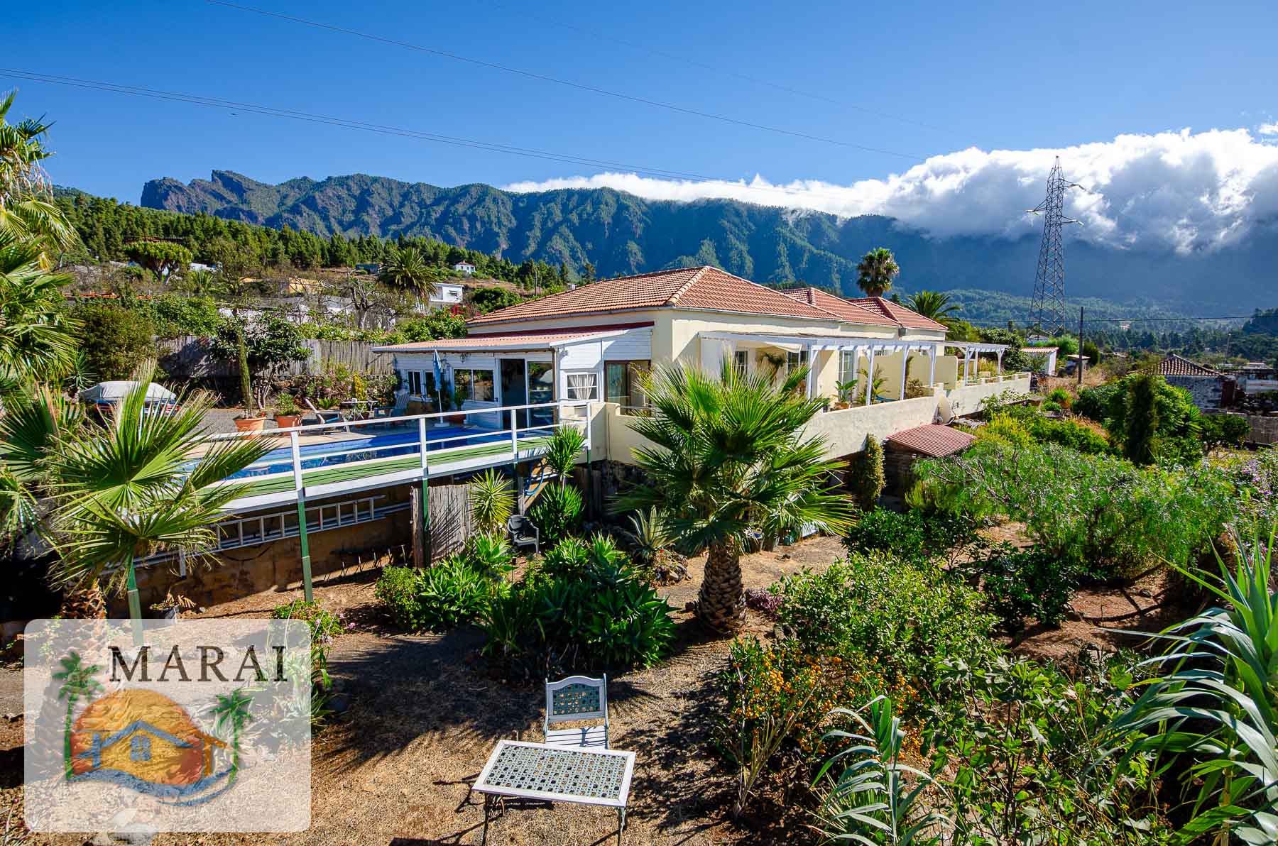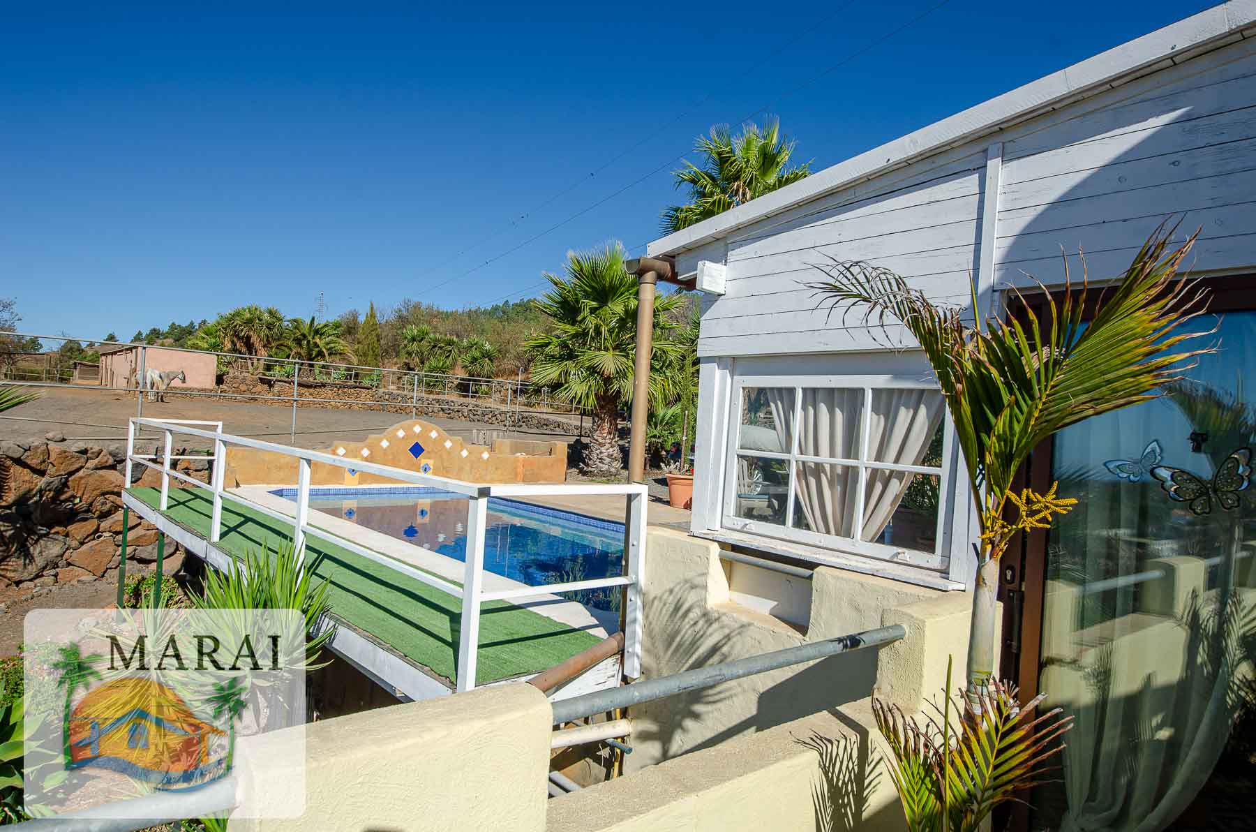 Und das ist die zweite Doppelhaushälfte (hier finden Sie das zweite Wohnhaus), ebenfalls mit Garten in herrlicher Lage mit Blick auf die Berge und das Meer in El Paso, die zum Verkauf steht. Zusätzlich hat das Haus auch einen Swimmingpool von ca. 20 m² und 1,50 Meter Tiefe. Am Haus angebaut ist ein Vorbau aus Holz von ca. 30 m² mit kleiner Küche, Essgruppe und Sofa; falls die Sonne mal zu stark scheint.