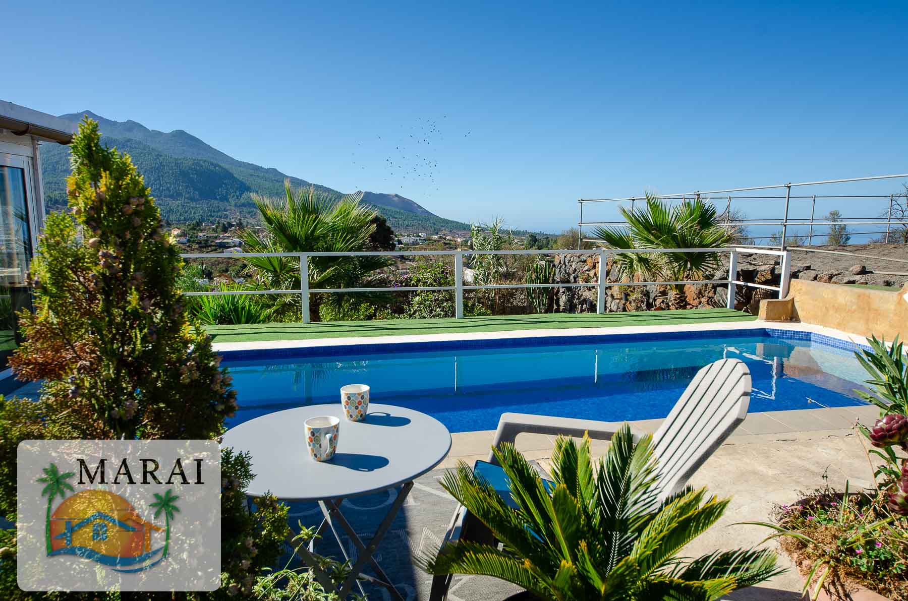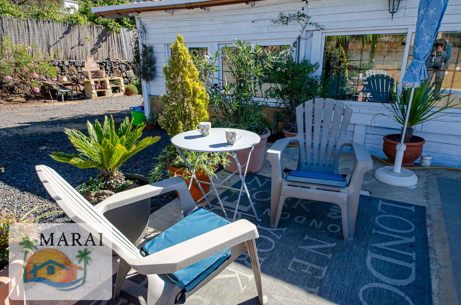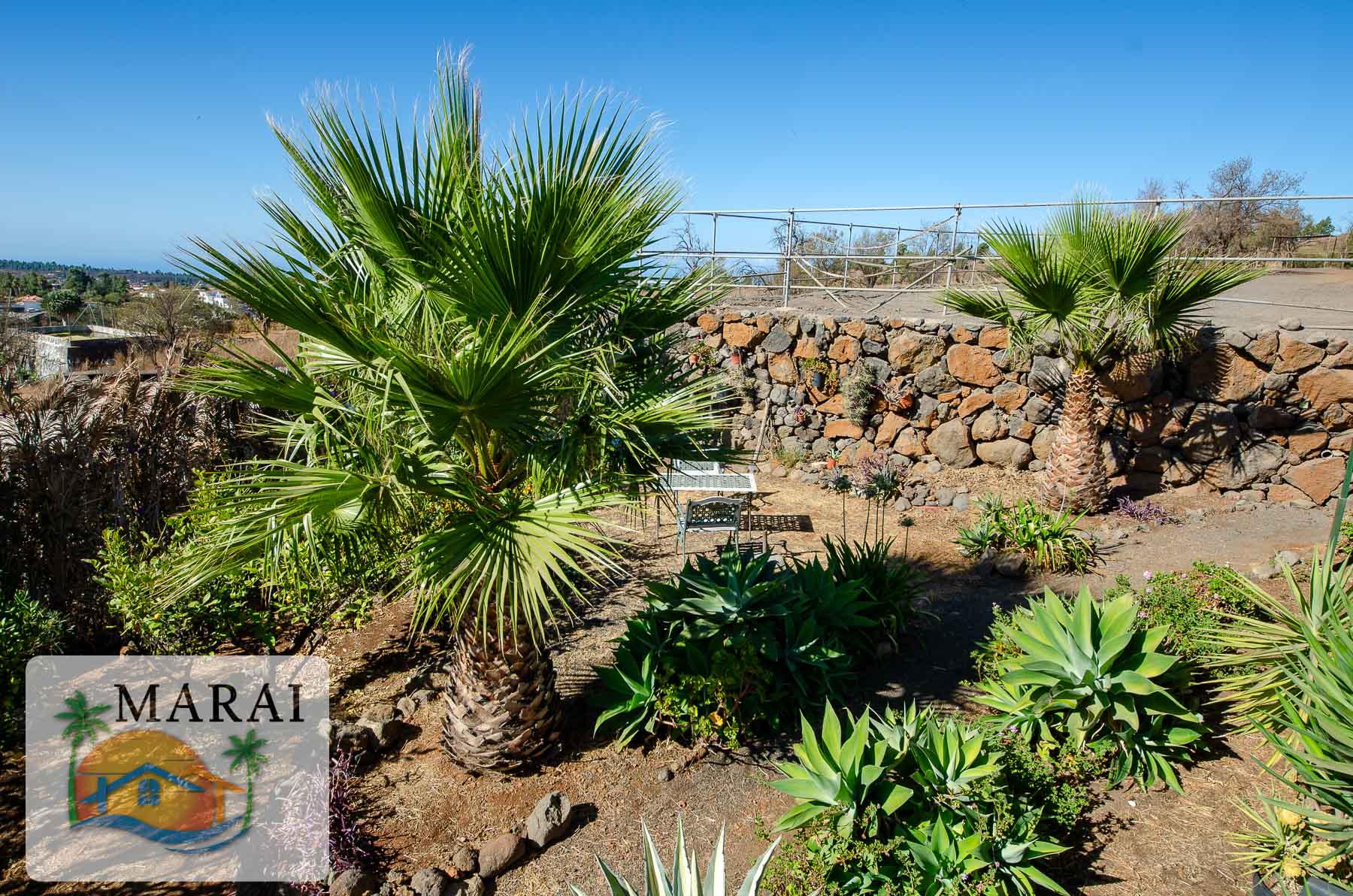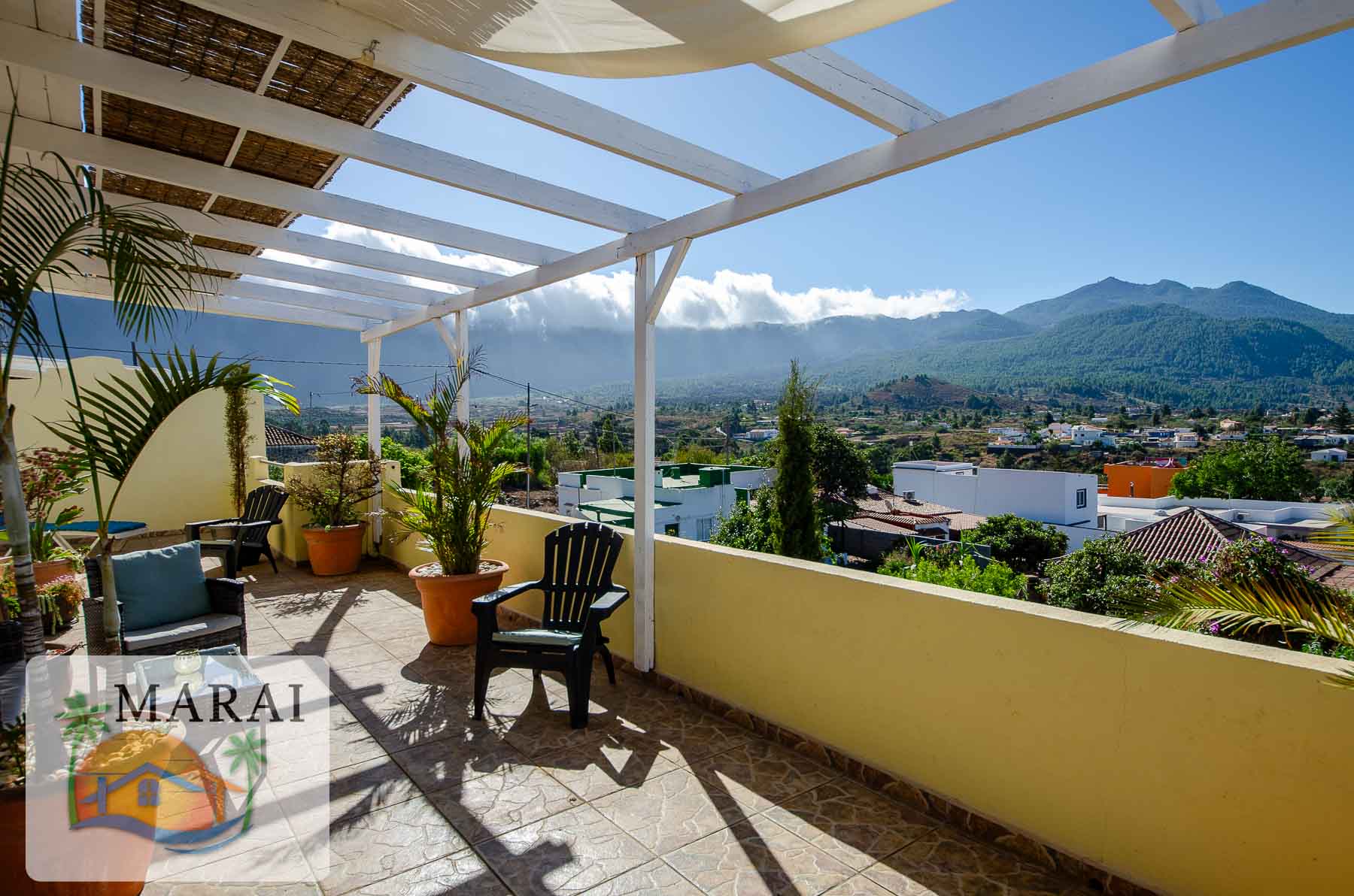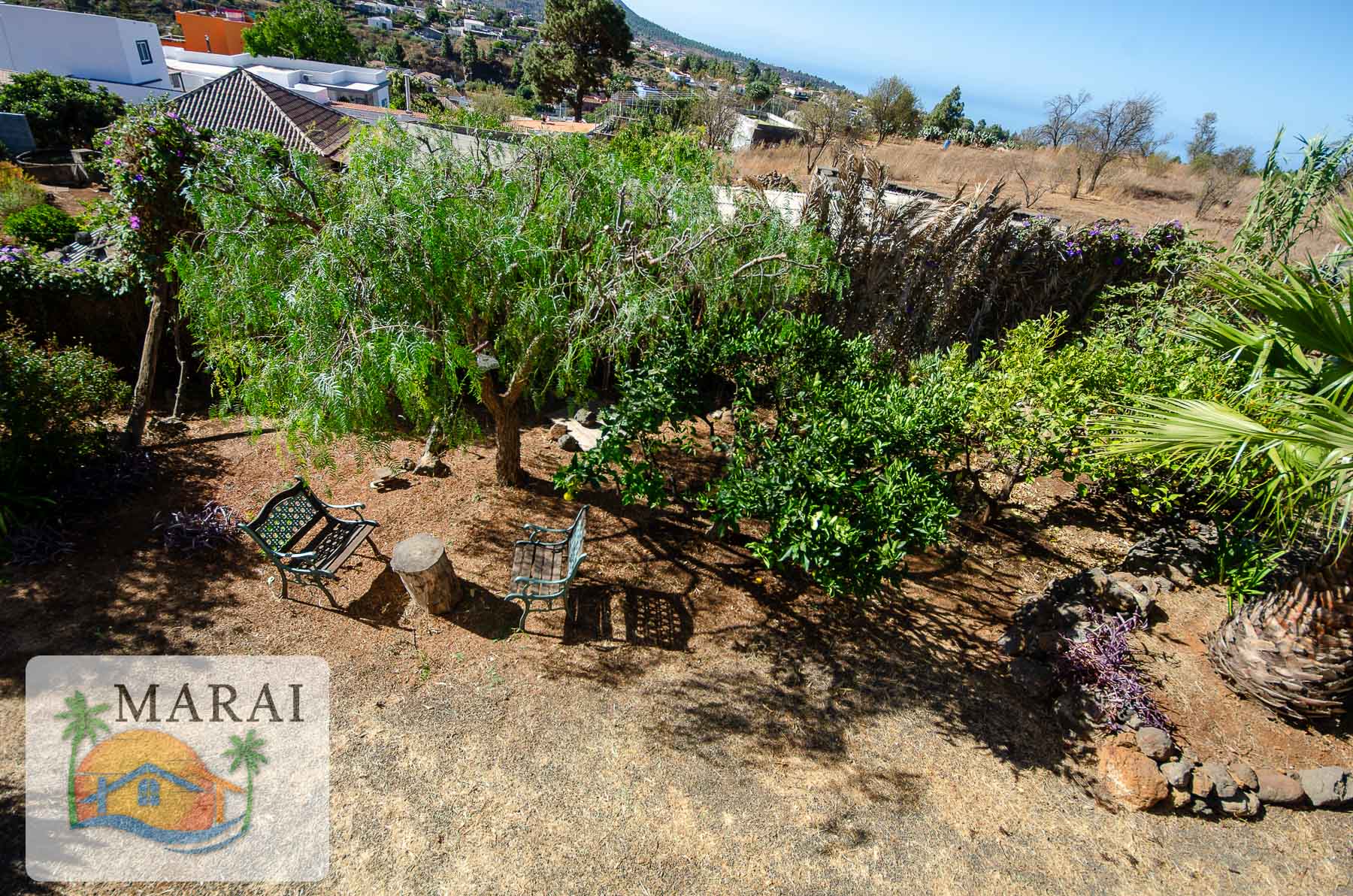 Und das ist die zweite Doppelhaushälfte (hier finden Sie das zweite Wohnhaus), ebenfalls mit Garten in herrlicher Lage mit Blick auf die Berge und das Meer in El Paso, die zum Verkauf steht. Zusätzlich hat das Haus auch einen Swimmingpool von ca. 20 m² und 1,50 Meter Tiefe. Am Haus angebaut ist ein Vorbau aus Holz von ca. 30 m² mit kleiner Küche, Essgruppe und Sofa; falls die Sonne mal zu stark scheint.