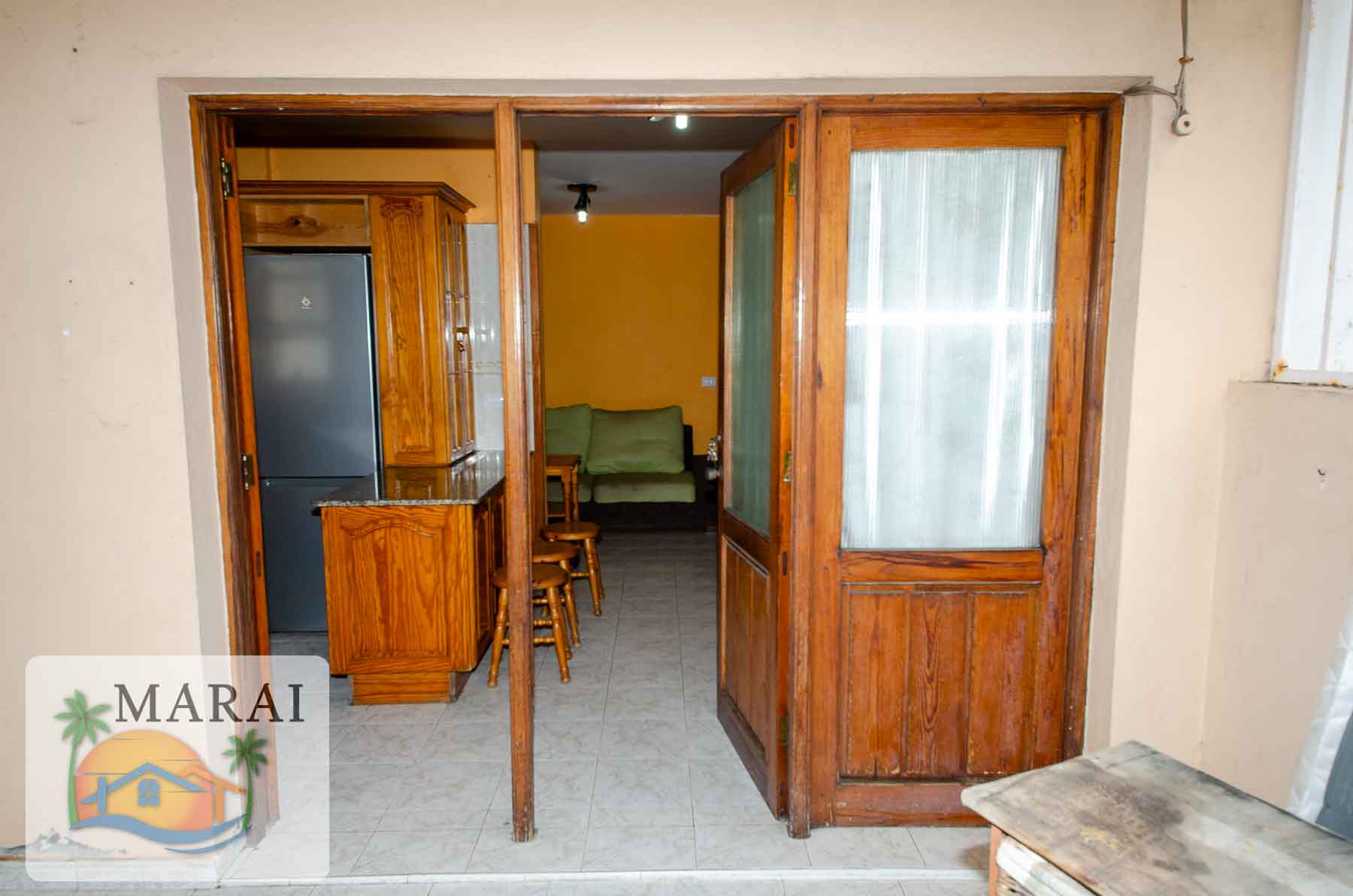The flat is located on the ground floor of a three-storey building and has a surface area of approximately 76 m². It consists of two bedrooms, a bathroom and a small kitchen-living room, as well as a terrace overlooking a quiet street.