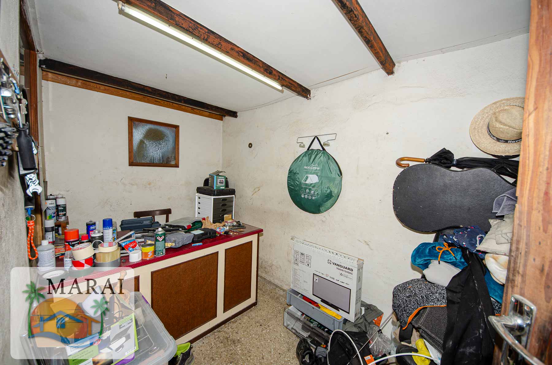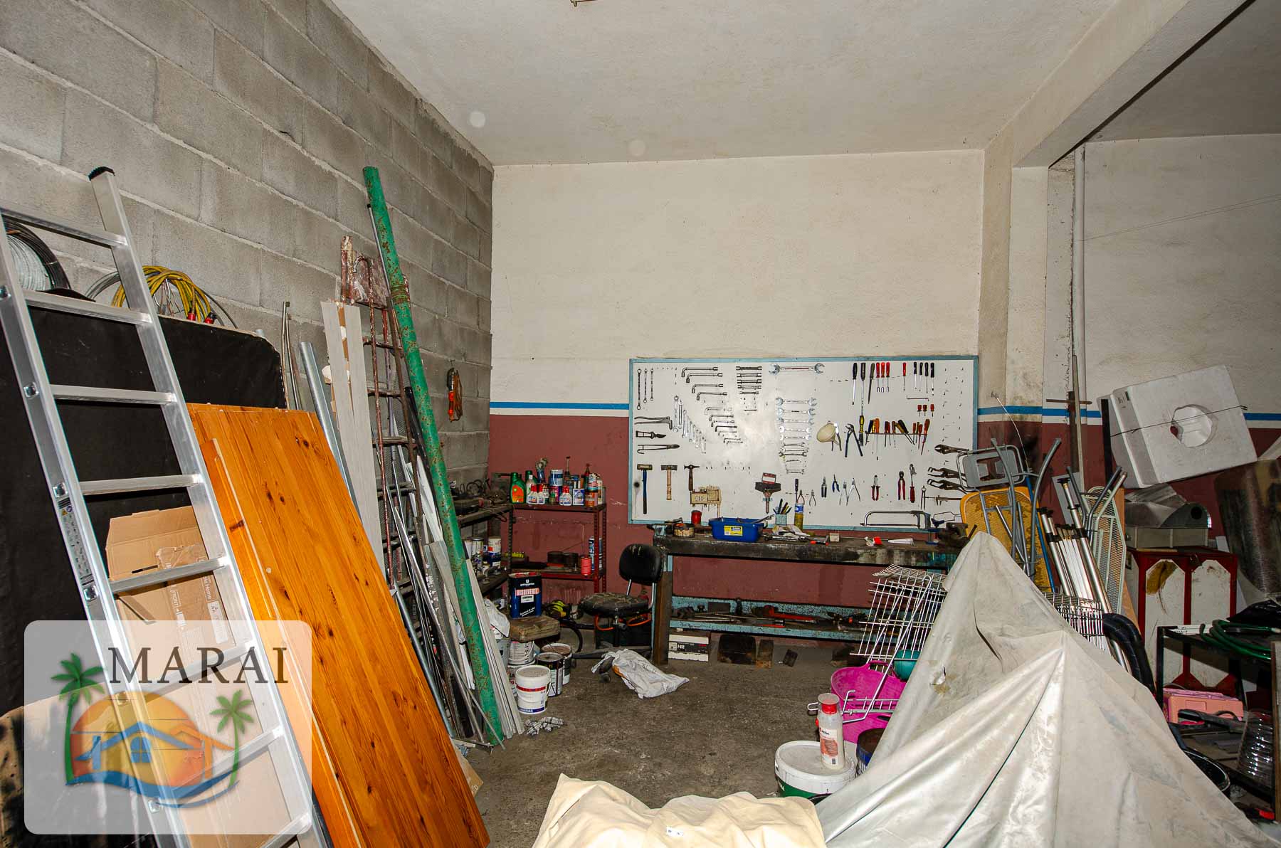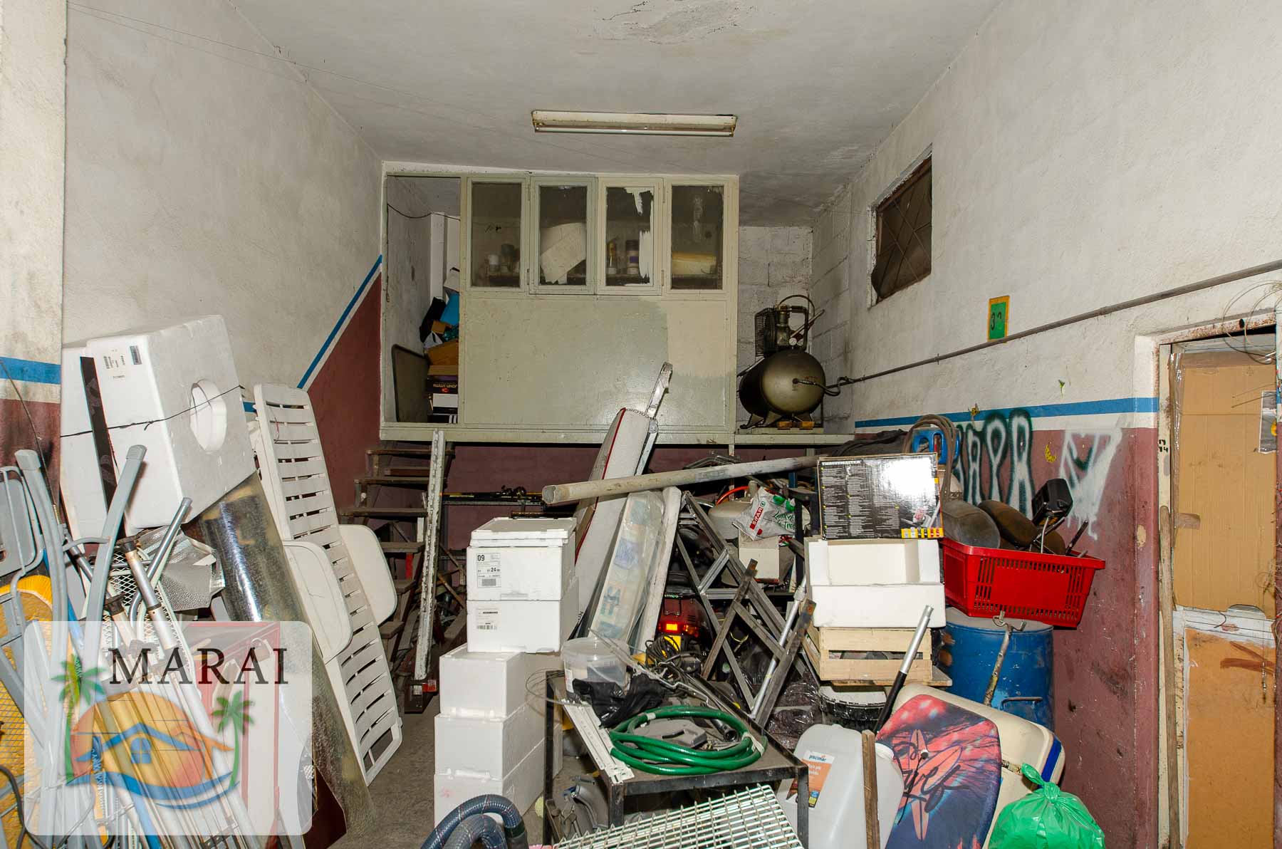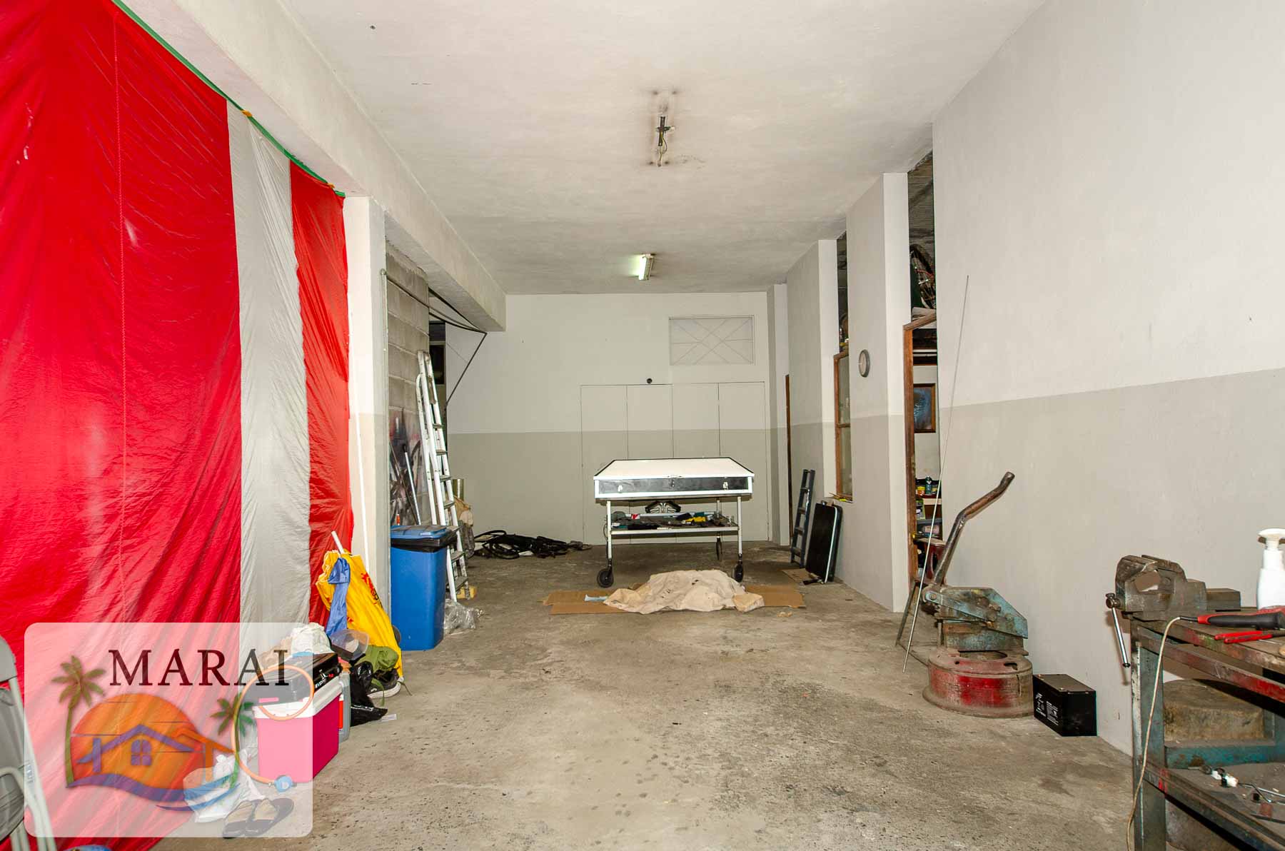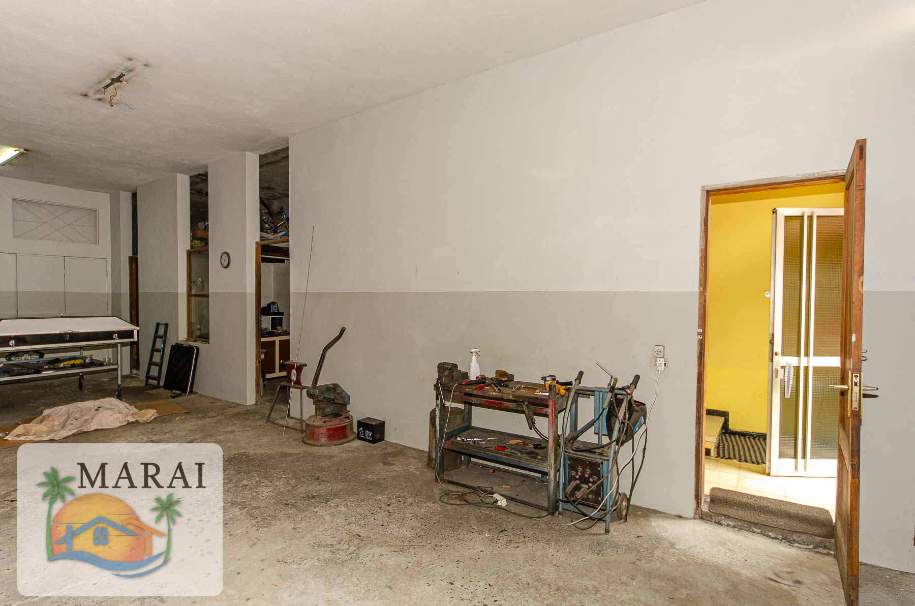 It features a large garage/commercial unit of around 160 m², as well as a second commercial unit of approximately 30 m² currently let, providing immediate rental income.